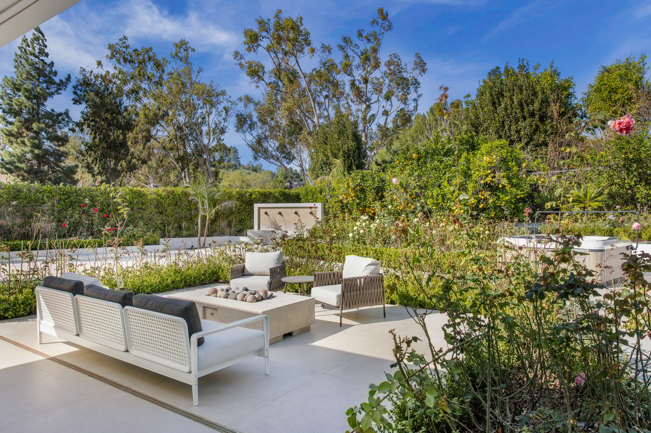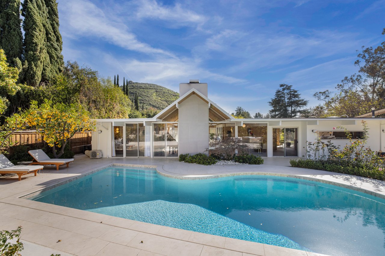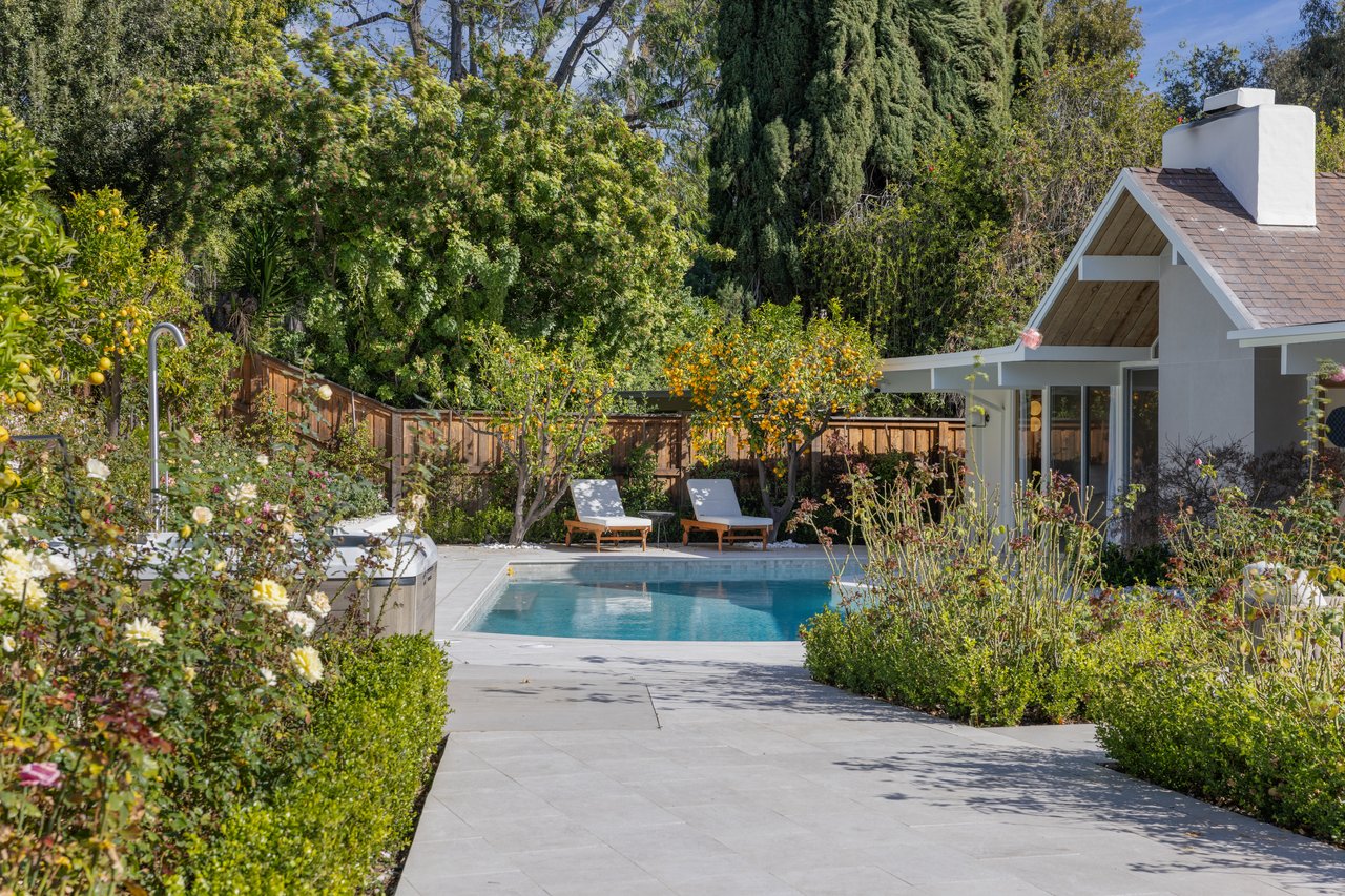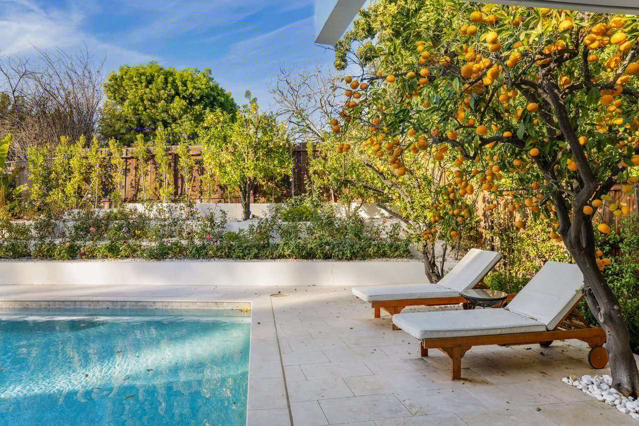 Light moves effortlessly here, through carefully considered openings and rain glass doors, illuminating living areas that feel expansive yet intimate. Outdoors, a saltwater pool glimmers beneath Italian marble, a redwood pergola invites long afternoons, and gardens of roses and mature fruit trees scent the air, creating a private sanctuary just far enough from the city to feel removed, yet close enough to work, play, and remain connected to Los Angeles.