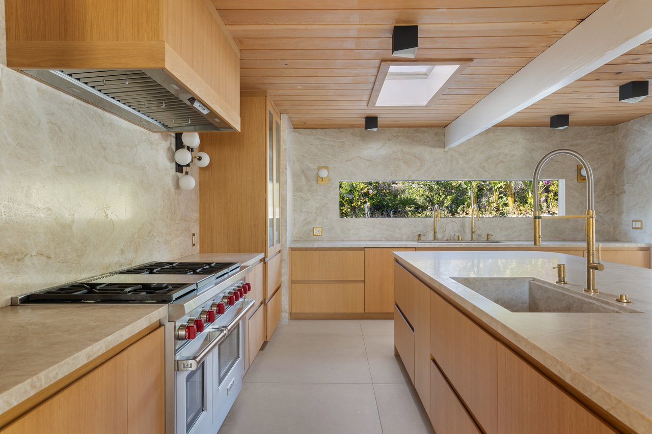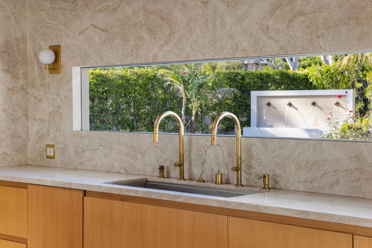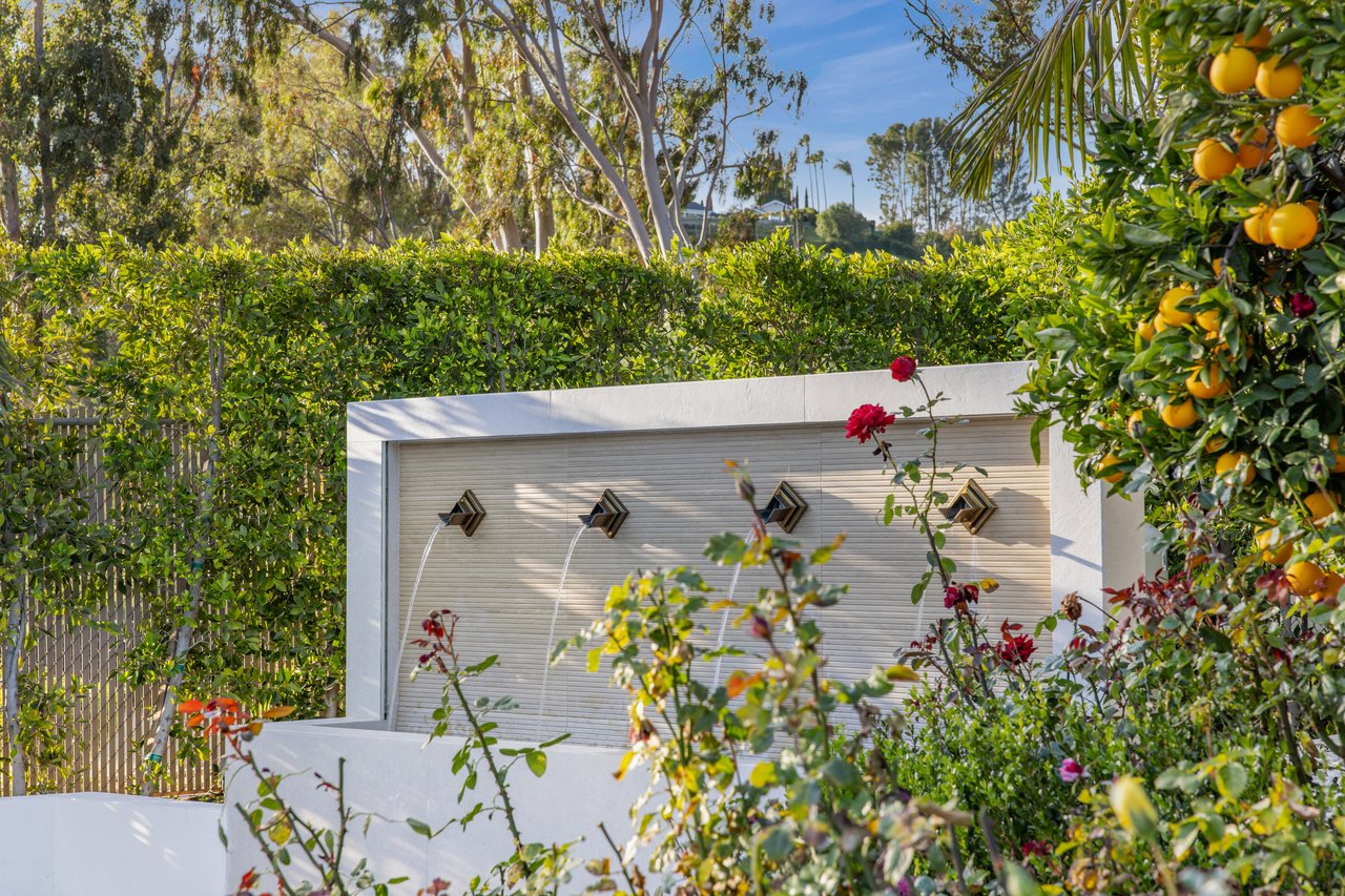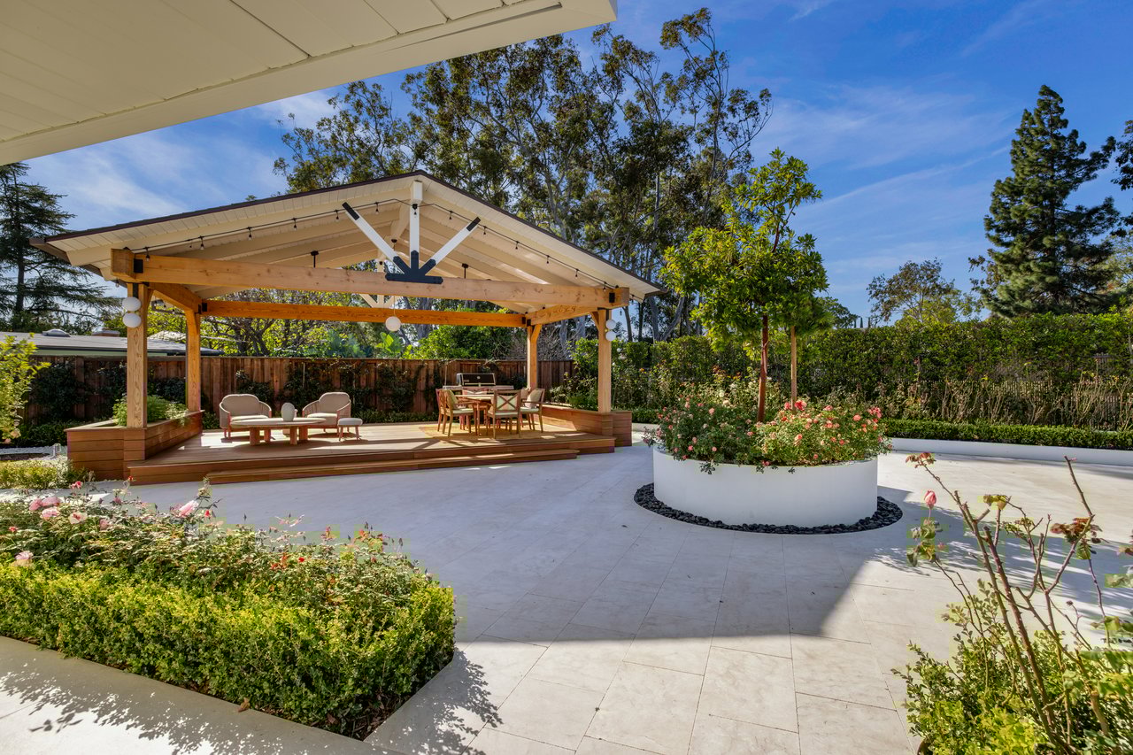 Light moves effortlessly here, through carefully considered openings and rain glass doors, illuminating living areas that feel expansive yet intimate. Outdoors, a saltwater pool glimmers beneath Italian marble, a redwood pergola invites long afternoons, and gardens of roses and mature fruit trees scent the air, creating a private sanctuary just far enough from the city to feel removed, yet close enough to work, play, and remain connected to Los Angeles.
