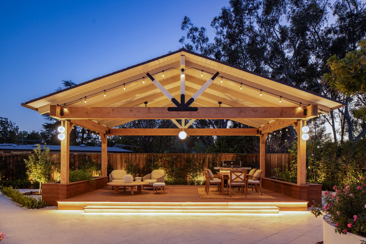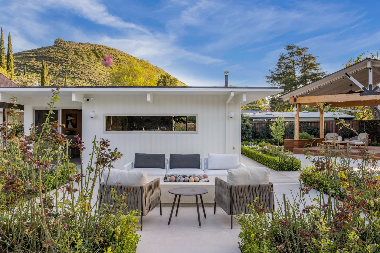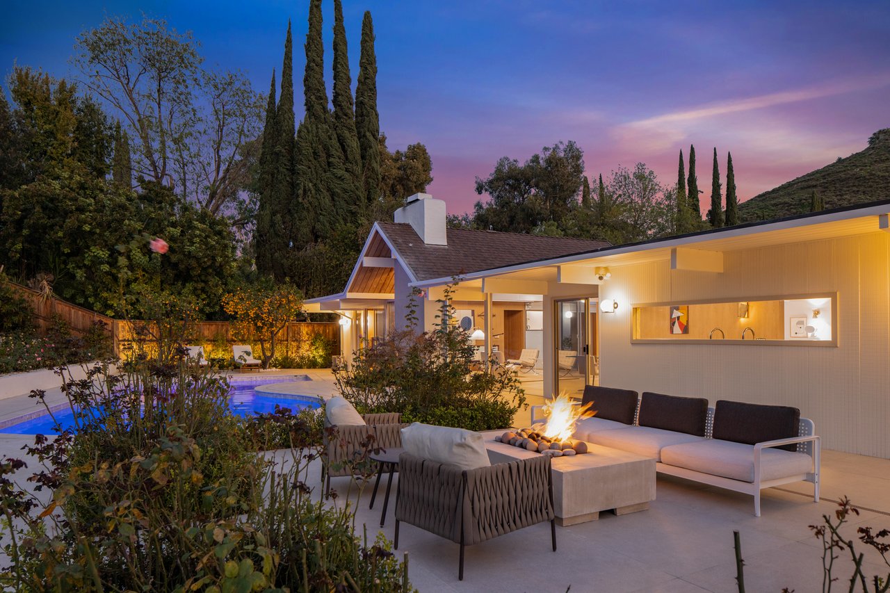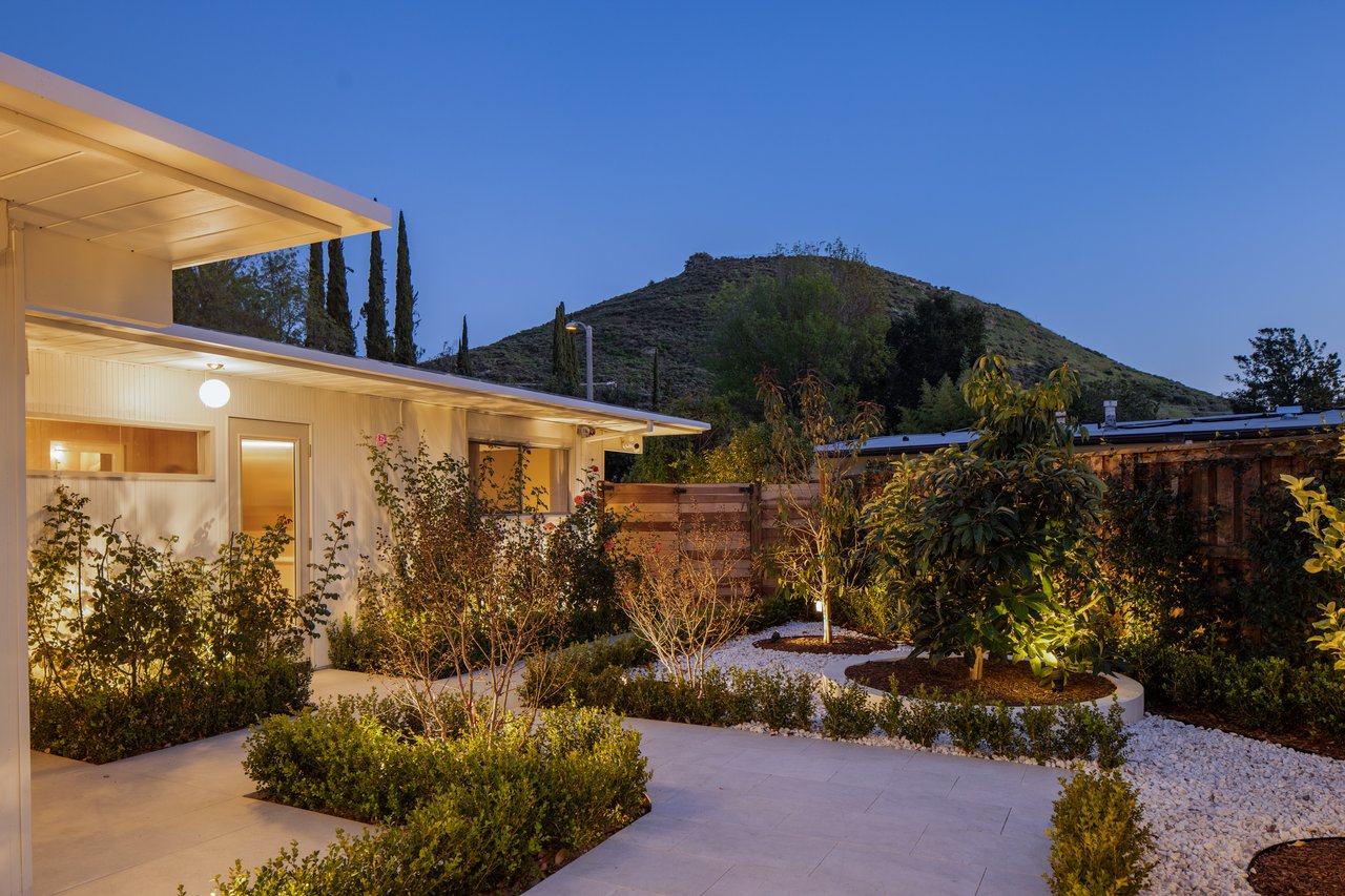 Light moves effortlessly here, through carefully considered openings and rain glass doors, illuminating living areas that feel expansive yet intimate. Outdoors, a saltwater pool glimmers beneath Italian marble, a redwood pergola invites long afternoons, and gardens of roses and mature fruit trees scent the air, creating a private sanctuary just far enough from the city to feel removed, yet close enough to work, play, and remain connected to Los Angeles.