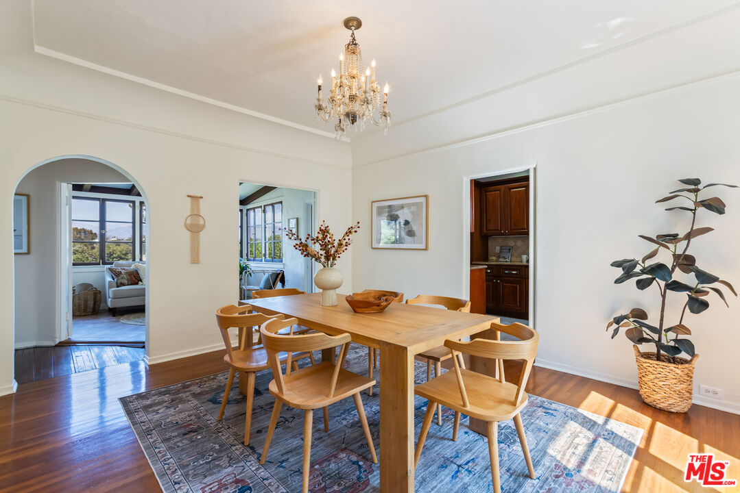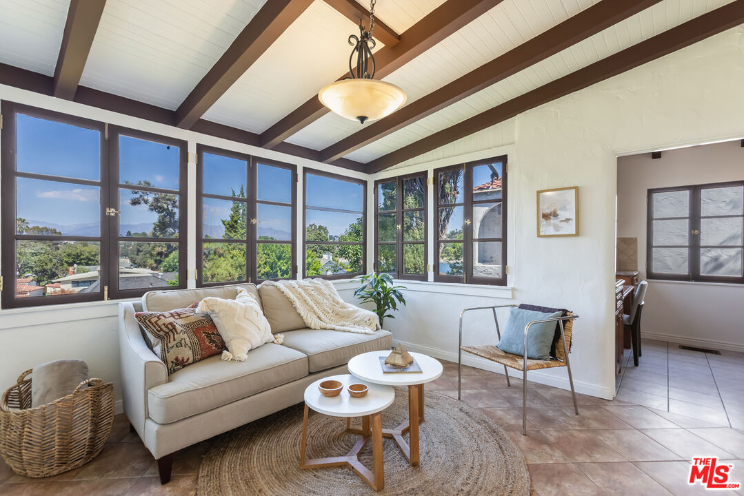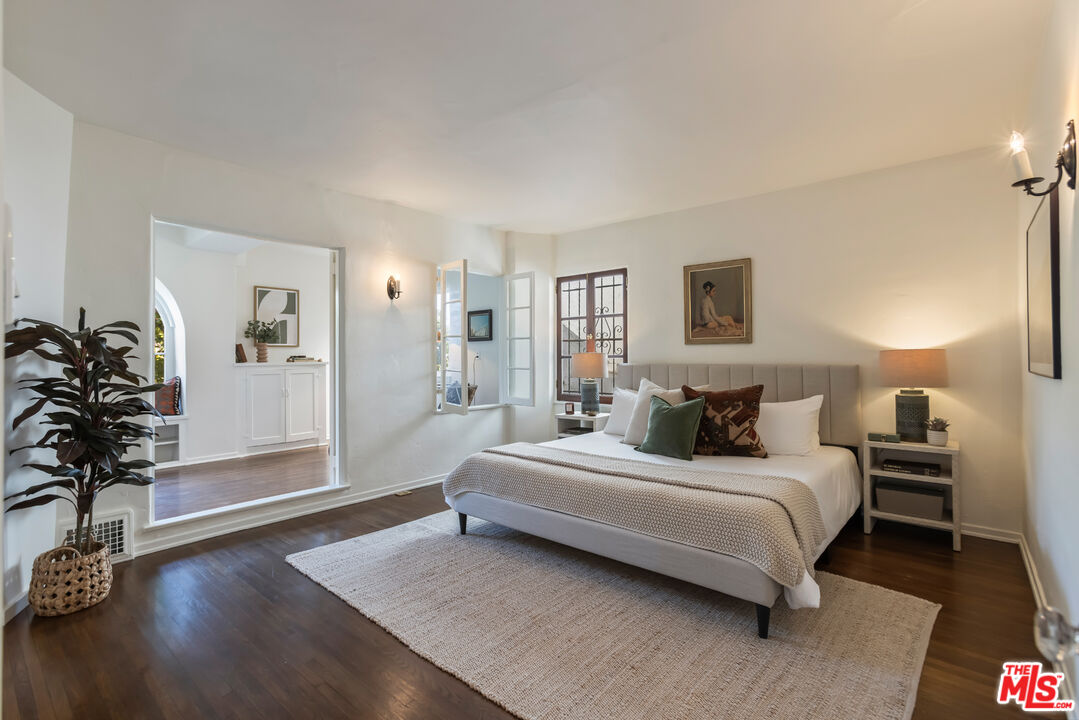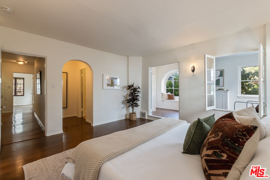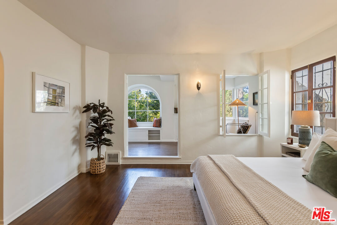 This stunning Spanish home located in Silver Lake's highly coveted Moreno Highlands. A welcoming arched front gate, a beautiful arched front door framed by tiered stucco detailing, and a front courtyard accented with colorful tile. Inside, the home features timeless character, with a foyer highlighted by elegant leaded glass windows and a formal living room that offers wood beamed ceilings, a fireplace, and oversized windows with lush treetop and hillside views. A formal dining room with arched doorways adds charm, while the family room with wood beamed ceilings captures serene treetop and Silver Lake Reservoir views. The kitchen provides abundant cabinetry and generous counterspace, making it ideal for cooking. The first floor also includes a versatile office or bedroom with a guest bathroom. Downstairs are three bedrooms and two bathrooms. The primary bedroom with an arched window includes an ensuite bathroom and a walk-in closet for comfort and privacy. An additional oversized bedroom features a fireplace and its own walk-in closet, with both rooms offering direct access to the backyard. The expansive backyard provides plenty of space to relax, entertain, and enjoy the outdoors. Ideally located in the highly desirable district for Ivanhoe Elementary School, near the Silver Lake Reservoir, LaMill Coffee, L&E Oyster Bar, Bar Siesta, Trader Joe's, and Gelson's. Don't miss this incredible opportunity to own a beautiful home!