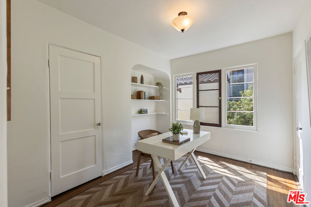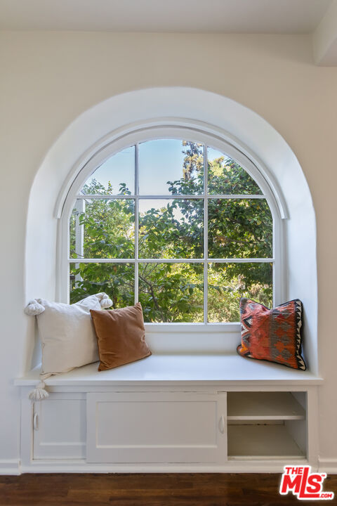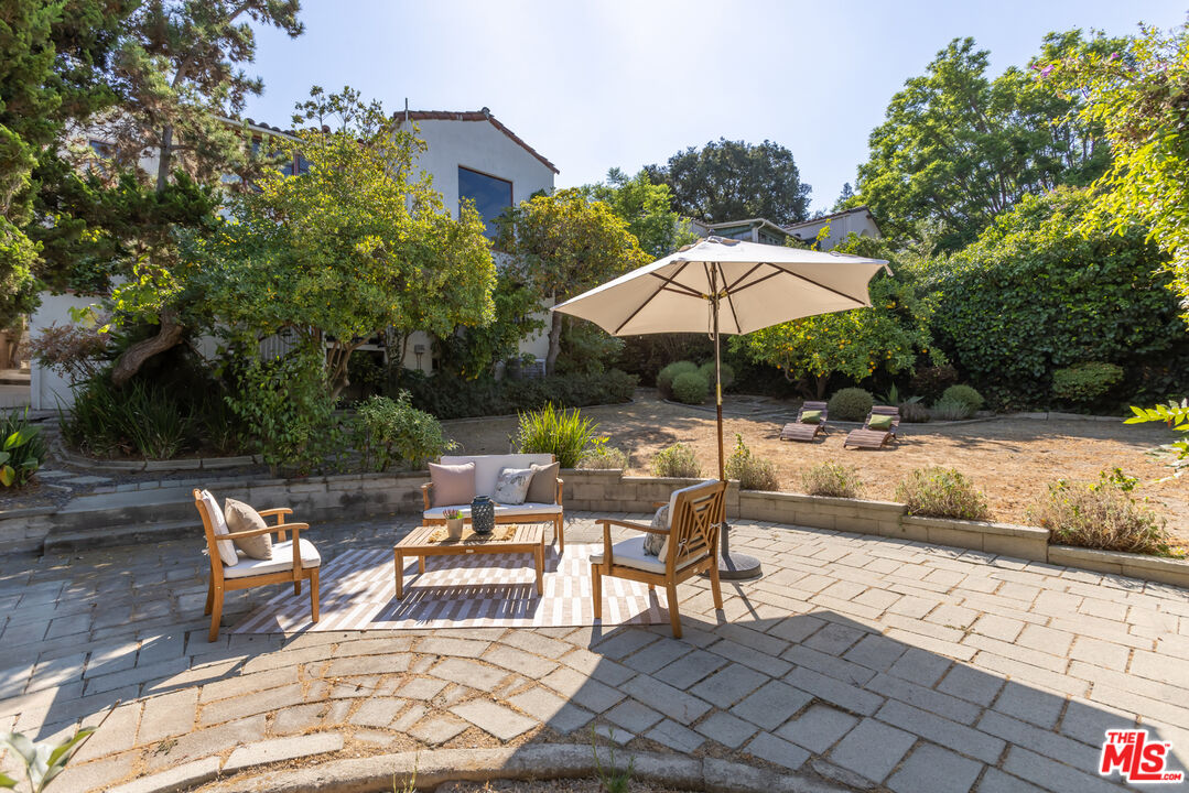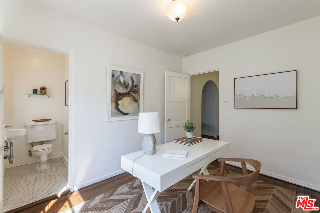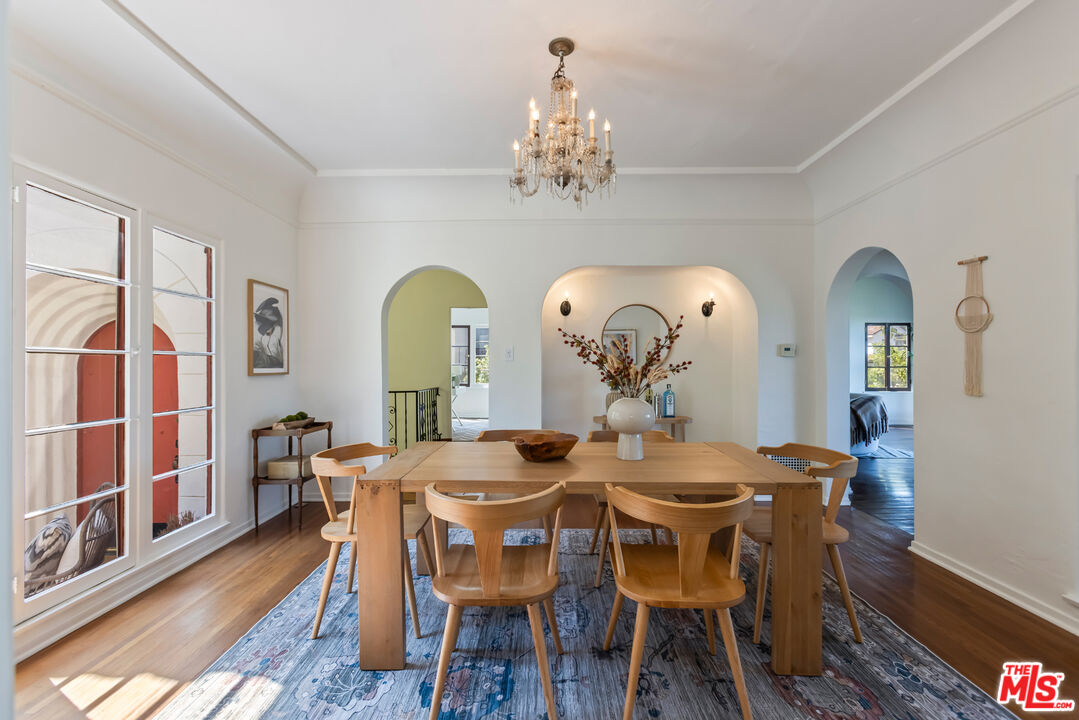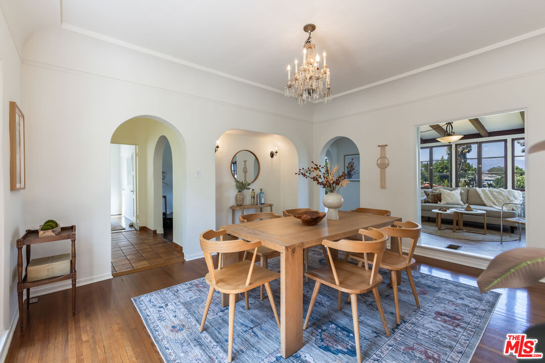 This stunning Spanish home located in Silver Lake's highly coveted Moreno Highlands. A welcoming arched front gate, a beautiful arched front door framed by tiered stucco detailing, and a front courtyard accented with colorful tile. Inside, the home features timeless character, with a foyer highlighted by elegant leaded glass windows and a formal living room that offers wood beamed ceilings, a fireplace, and oversized windows with lush treetop and hillside views. A formal dining room with arched doorways adds charm, while the family room with wood beamed ceilings captures serene treetop and Silver Lake Reservoir views. The kitchen provides abundant cabinetry and generous counterspace, making it ideal for cooking. The first floor also includes a versatile office or bedroom with a guest bathroom. Downstairs are three bedrooms and two bathrooms. The primary bedroom with an arched window includes an ensuite bathroom and a walk-in closet for comfort and privacy. An additional oversized bedroom features a fireplace and its own walk-in closet, with both rooms offering direct access to the backyard. The expansive backyard provides plenty of space to relax, entertain, and enjoy the outdoors. Ideally located in the highly desirable district for Ivanhoe Elementary School, near the Silver Lake Reservoir, LaMill Coffee, L&E Oyster Bar, Bar Siesta, Trader Joe's, and Gelson's. Don't miss this incredible opportunity to own a beautiful home!