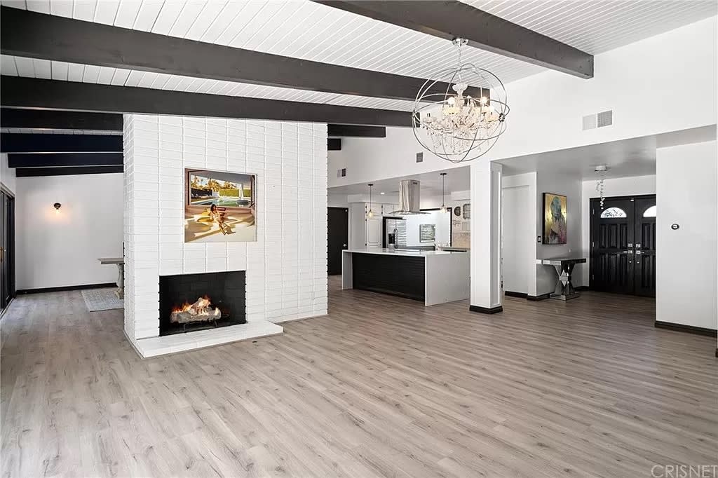 Completely remodeled single story Mid Century Charles Dubois pool home located on a sweeping corner lot of a cul-de-sac! Stunning design and open living spaces are present upon entering the double door entry with separate guest bath. The large living and dining rooms boast vaulted wood beamed ceilings, sliding glass doors that lead out to the covered patio, and both rooms share a double sided white brick fireplace. The open chef s kitchen features large center island with quartz waterfall countertop & breakfast bar seating, farm sink, designer tile backsplash, stainless steel appliances, and separate breakfast nook with pantry. There are three bedrooms including the spacious primary suite featuring vaulted ceiling, sliding door out to the yard, walk-in wardrobe area with double closets, plus huge private bath with quartz counters, double sinks with makeup vanity space, walk-in shower, & separate claw foot tub. Two additional secondary bedrooms feature high ceilings and share a bathroom with double sinks, walk-in shower, and wainscot moldings. The entertainer s backyard features swimming pool and spa, expansive covered patio, synthetic lawn space, and private lush landscaping. Direct access to the attached 2-car garage with additional driveway parking. Zoned for award-winning El Camino and Hale charter schools, and adjacent to Warner Center, The Village, dining, and shopping.